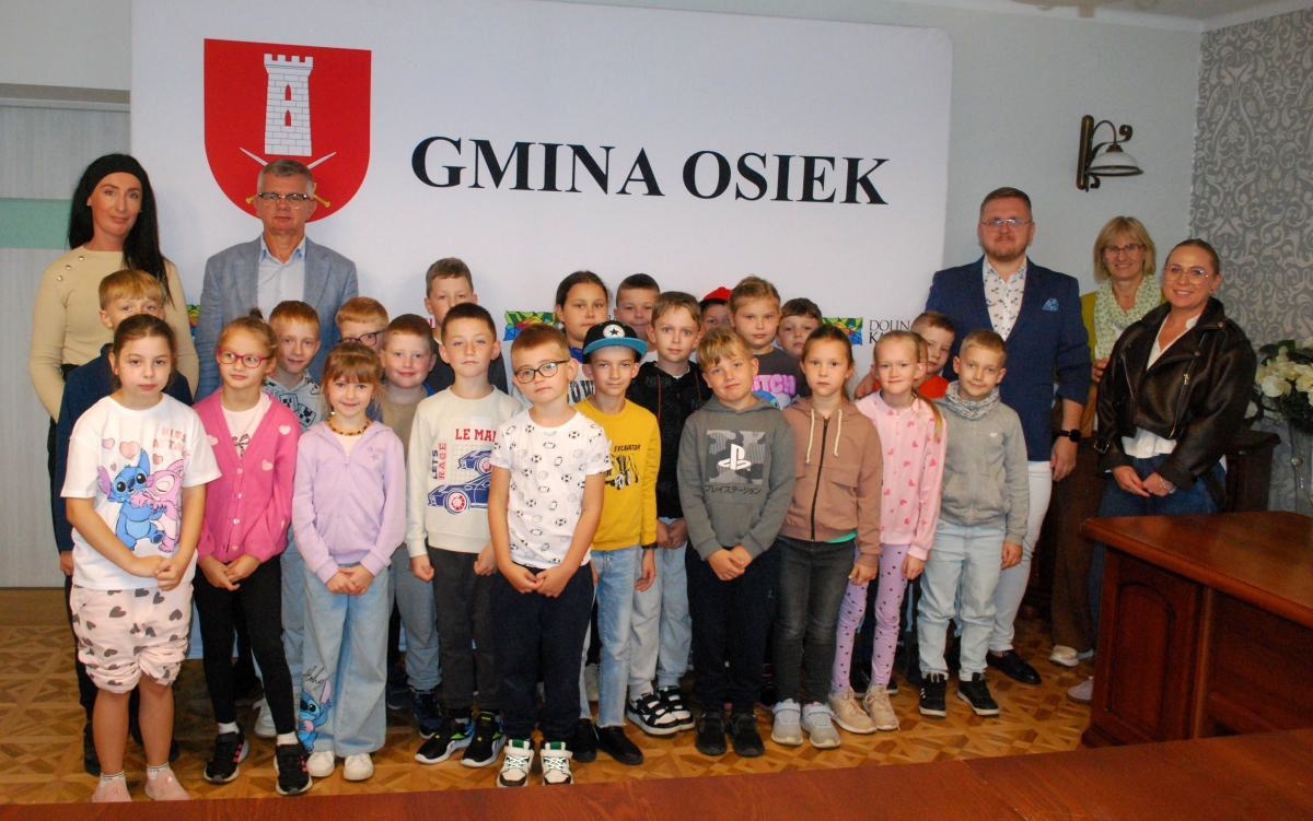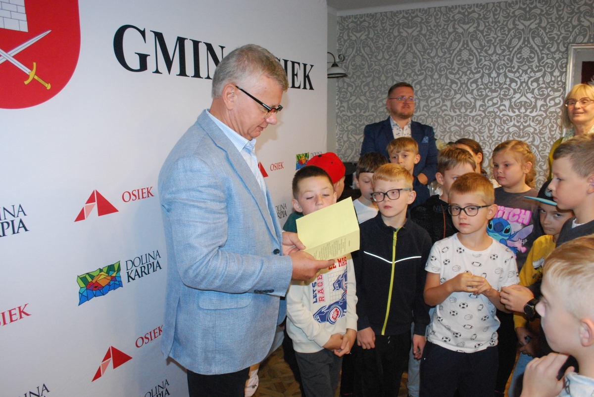 Na zakończenie wizyty, uczniowie wręczyli Wójtowi Gminy Osiek Panu Markowi Jasińskiemu specjalnie przygotowaną laurkę, jako wyraz wdzięczności za gościnę i edukacyjne doświadczenie.