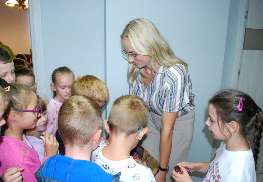 Na zakończenie wizyty, uczniowie obdarowani zostali słodkimi upominkami w postaci cukierków, co wywołało wiele radości i uśmiechu na ich twarzach. Była to doskonała okazja, aby podziękować im za aktywne uczestnictwo w spotkaniu.
